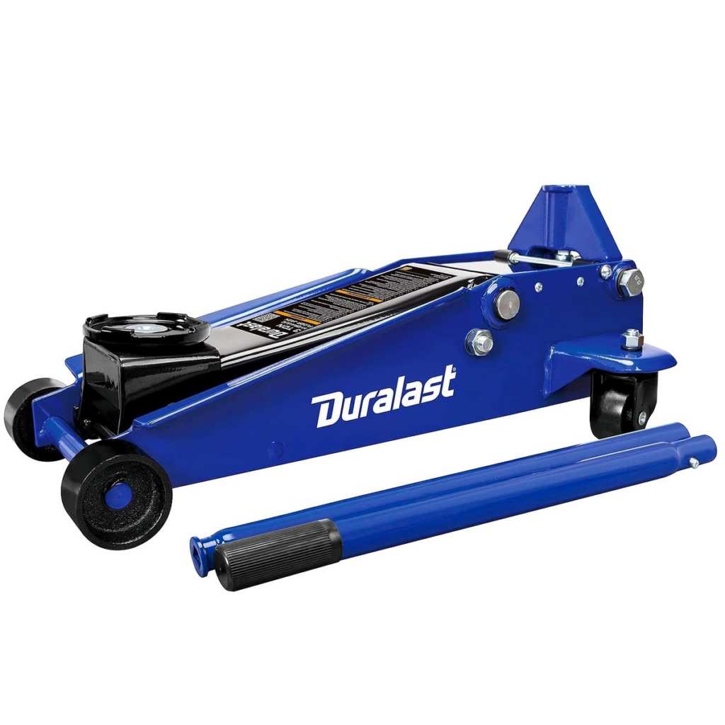 The Duralast 3-Ton Floor Jack uses a steel frame with a double-pump piston system to speed up initial lifting. Its lift range starts at just over five inches and reaches the mid-18-inch range. A U-joint release mechanism allows the jack to lower the vehicle in a controlled manner even when the handle isn’t perfectly aligned.
